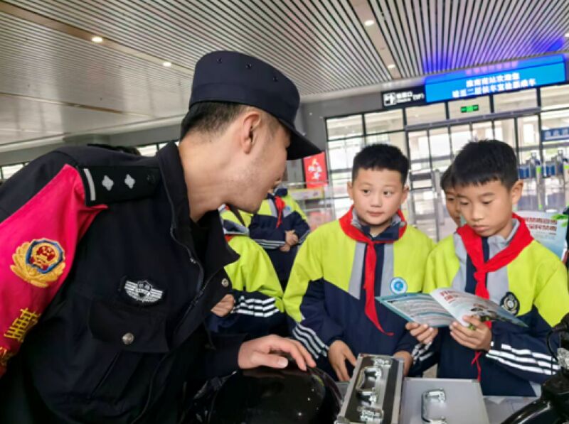 活動中,民警與車站工作人員帶領孩子們參觀服務臺、安檢通道、候車室、列車等,現場演示警械使用、票證查驗和安全乘車流程,開展禁毒、護路宣傳,并贈送“護路禮包”。下一步,雙方將建立長期幫扶機制,用警色守護童心。