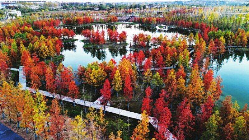 立冬時節,淮南春申湖公園內水杉、烏桕等植物五彩斑斕,色彩旖旎,構成一幅精美的“油畫”。