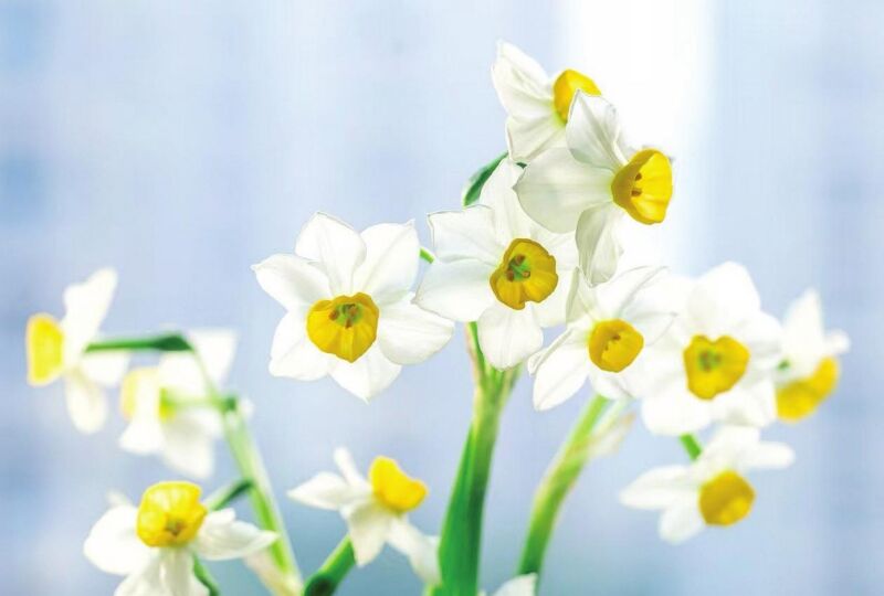 家庭水養水仙花——水仙可盆栽亦可水養,一般家庭多用水養。水養水仙要先剝去球莖外皮并去除根部護泥和枯根,用刀剝去上部3-4層外表皮,露出花芽,再將鱗莖放入清水中浸泡一夜,然后擦去切口粘液,直立放入水仙淺盆,加水淹沒鱗莖三分之一處為宜。盆中可用石英砂、鵝卵石等將鱗莖固定。初養時晚上倒掉盆水,次日清晨換水,稍后2-3天換水一次,花苞形成后每周換水一次。水養水仙要給予充足光照,白天置盆于陽光充足之處,晚上移入室內燈光之下,可防止莖葉徒長,使其葉色碧綠,花開香濃。水仙在10-15℃環境下生長良好,45天左右即可開花,花期可持續月余。水養水仙一般無需施肥,開花期間可稍施速效磷肥,使花朵綻放更加艷麗。