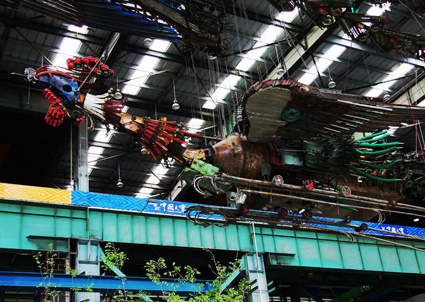 五月四日,記者進去參觀采訪時,正趕上一件藝術品在吊裝、布展。這件藝術品非同一般,是兩只長約二十七八米、寬約六米的巨型“鳳凰”,它由著名藝術家、中央美院副院長徐冰領銜設計。說其非同一般,記者發現這兩只欲飛沖天的美麗鳳凰全部由北京奧運各工地建筑垃圾廢料“拼湊”而成,實在是美輪美奐、巧奪天工——鳳凰的脖子是一個挖掘機的前臂,砸土機強悍的頭部正好是神鳥的頭部,加上多只塑料安全帽充當鳳凰的鳳冠,顯得機智和幽默(見圖2)。長長翅膀和尾部是一排排建筑工地的毛竹,一片片羽毛是工人使用的鐵锨。《南方周末》有評論撰文,這件藝術品展示了中國當今時代快速成長背后的復雜命題,原始積累、輝煌背后的勞動價值,印證中國文化之崛起如浴火鳳凰。還有評論家指出,這個作品可以與當年墨西哥藝術家迭戈里維拉給美國洛克菲勒中心繪制的壁畫《十字路口上的人類》相提并論。