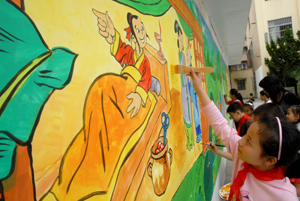 圖為學生在老師的指導下以墻畫形式描繪《三字經》中經典名句。