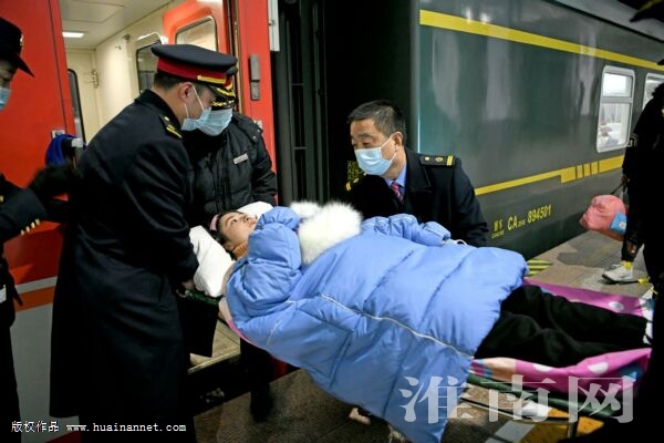 “列車進站了,我們在11號車廂等你。”對講機里傳來值班乘務員的聲音。淮南火車站黨員服務隊志愿者快速抬起擔架上的阿依古扎力奔向11號車廂。