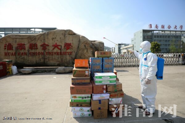 4月5日,淮南聯合大學校門外,一位防疫人員在為進校物資消毒。 (淮南日報全媒體記者 張越 攝)