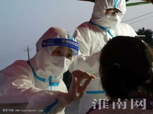 毛集實驗區毛集鎮醫療衛生系統工作人員蘇丹丹,參與全員核酸檢測工作,在毛集鎮一號街道為群眾做核酸檢測,工作到晚上十二點鐘。(通訊員 尹家權 淮南日報全媒體記者 劉銀昌)