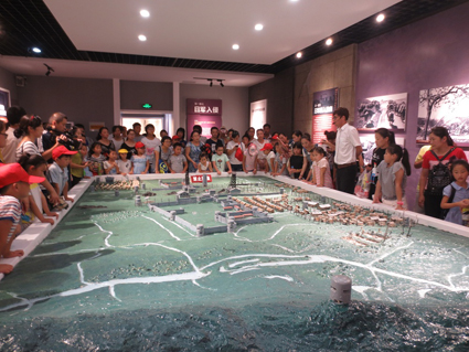 圖一、二:中小學生在沙盤前細心地聆聽講解員叔叔的解說
