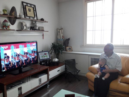 “正義必勝!和平必勝!人民必勝!”聽到電視里傳來的聲音,抗戰老兵單星激動地鼓起掌來。9月3日上午,中國人民抗日戰爭暨世界反法西斯戰爭勝利70周年紀念大會在北京舉行,今年90歲的單老早早起床,吃完早餐便與老伴守在家里的電視機前收看閱兵相關報道。